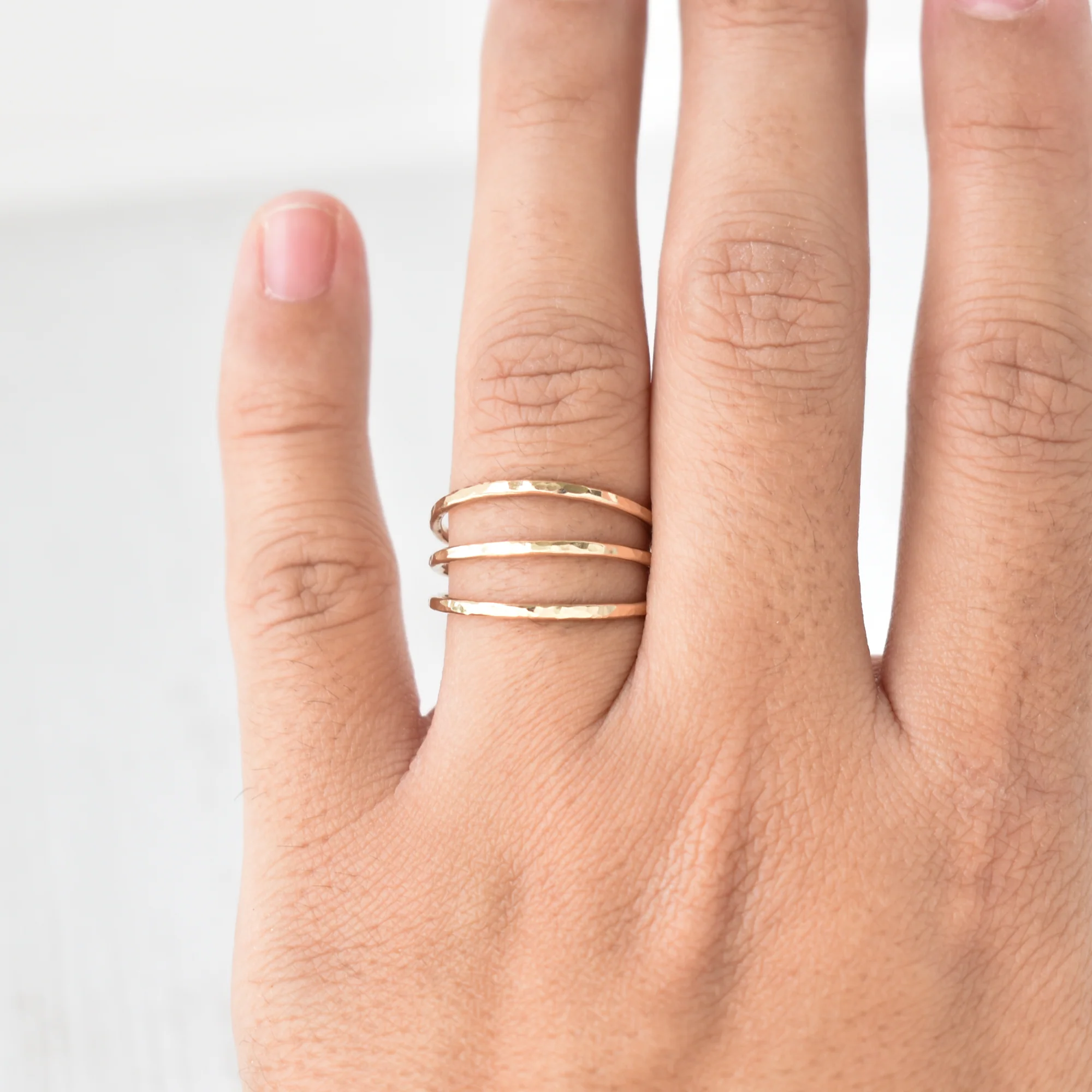Beautifully textured wire stacking rings are twisted and soldered in the back to appear as five rings but functions as a single ring. This design is great to keep the bands spaced for a different typed of stacked style. Great to wear alone or with other stacking rings!