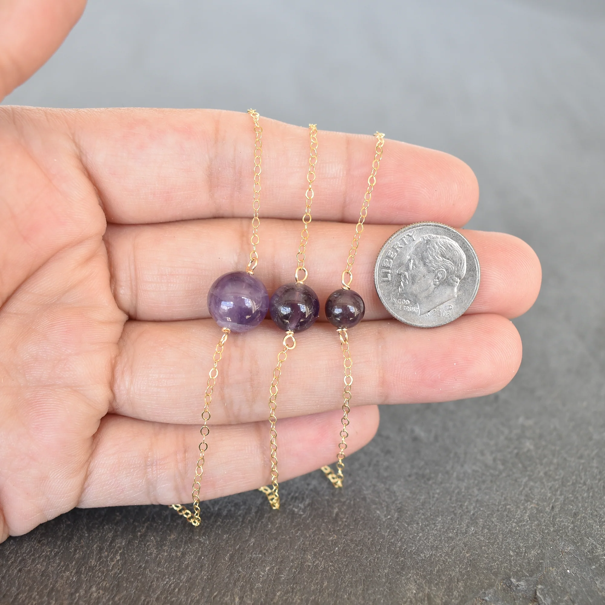 Pictures feature multiple necklaces to compare sizes of the gemstone.