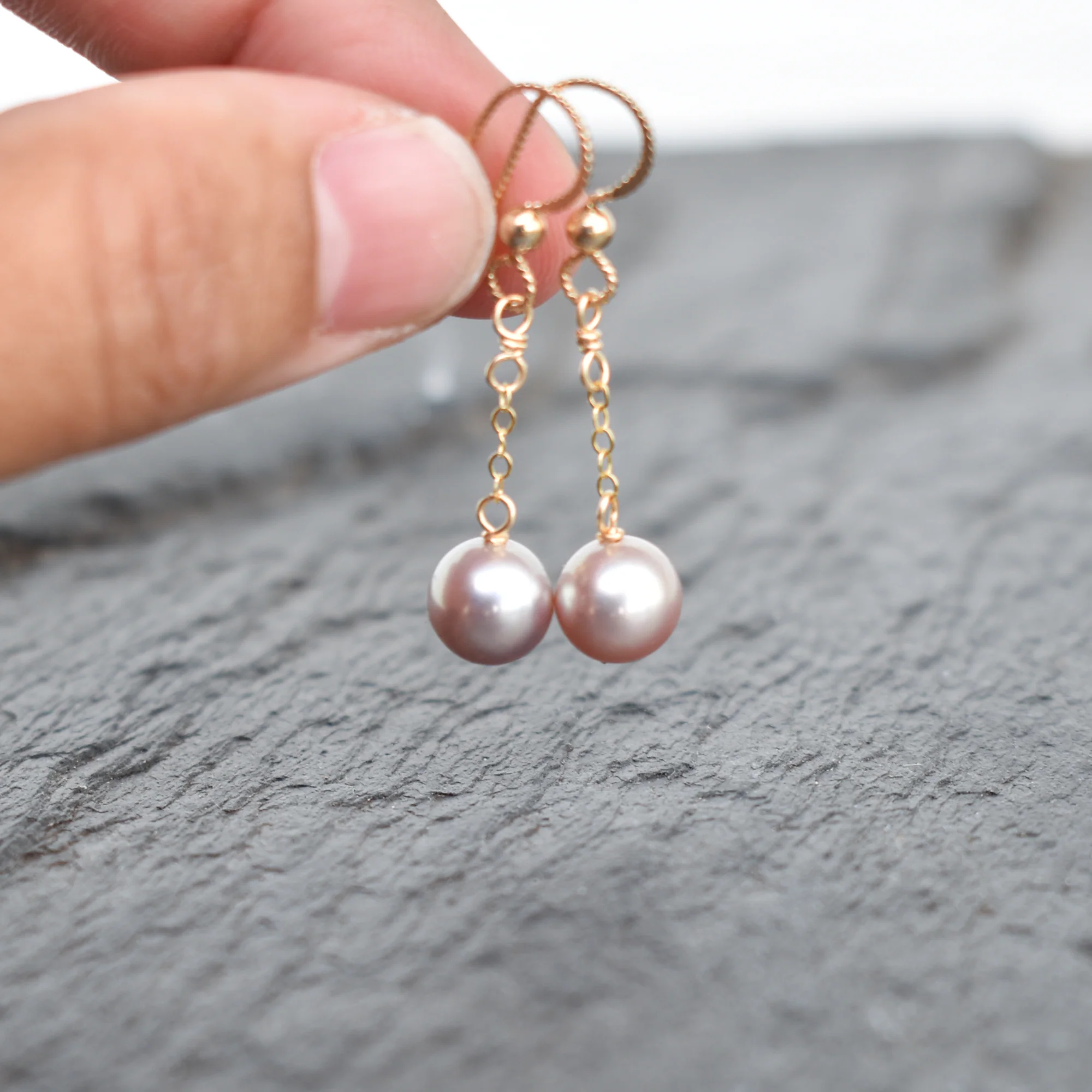 Very pretty light purple/pinkish colored freshwater pearls dangle gently from your choice of sterling silver or gold fill chain and hooks. This material will not tarnish and can even get wet!