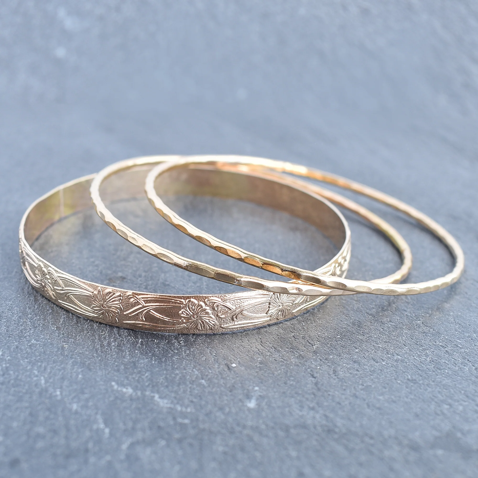 Two plain 12 gauge textured bangles with one patterned bangle of your choice.